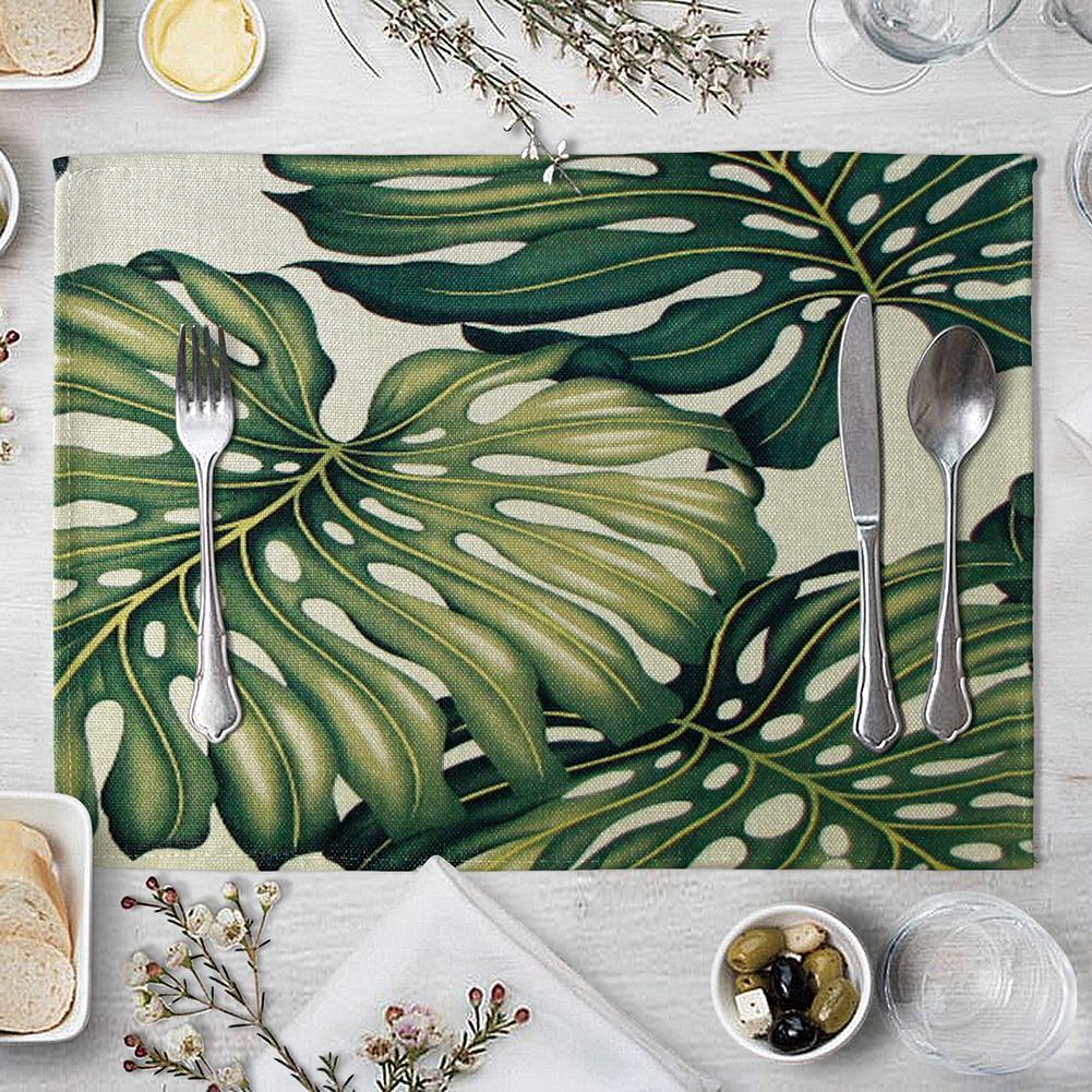 Green Leaves Pattern Western Pad 42x32cm Cotton Linen Placemat Insulation Dining Table Mat Bowls Coasters Kitchen Accessories